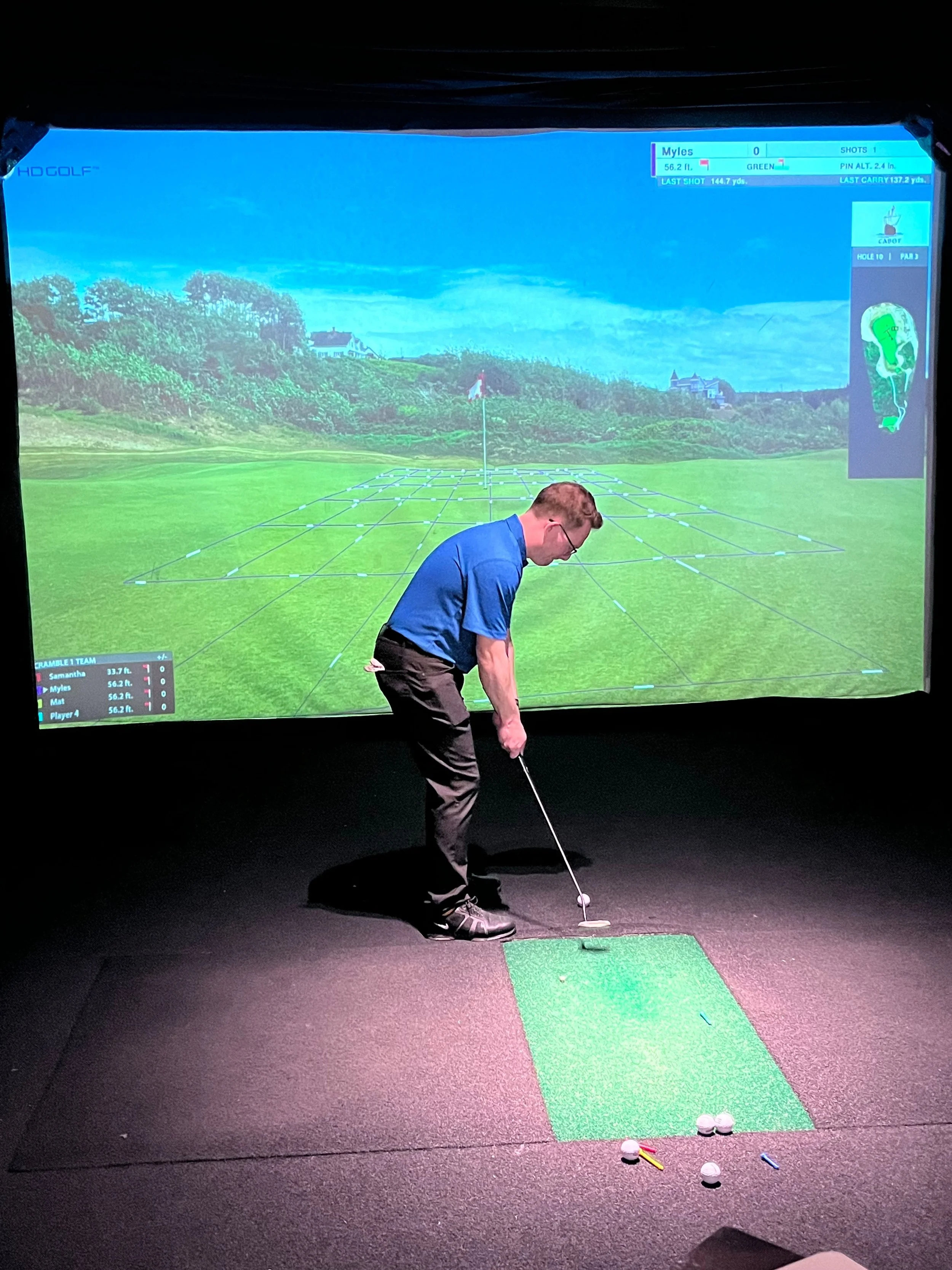An indoor Pebble Beach 9-hole golf simulator experience (no golf experience required)